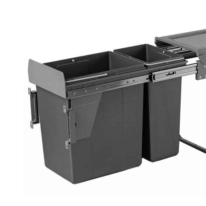 Dual Slim Rubbish Bin – With Door Mount This Domestique Slim 30L Twin Bin with door mount comprises a 20-litre and a 10-litre bin, perfect for separating general waste from recyclables. It requires a simple DIY installation as it mounts to the base of your cabinet (no tricky side-mounted sliders) and to the cabinet door. Its high-quality ball bearing runners feature soft close so your bin will not slam shut, but effortlessly slide gently back into place. Under Sink Kitchen Waste Organiser LARGE CAPACITY – Twin dark grey bin unit comes in 20L and 10L compartments CONVENIENT – Easily separate your garbage from recyclables or organics; removable bins also make it a breeze to empty and clean STURDY AND ACCESSIBLE – Soft closing ball bearing runners and stable frame made from durable stainless steel can hold up to 25kg when fully extended SANITARY – Engineer designed lid prevents odours EASY INSTALLATION – Just mount to the cabinet base and attach to your cupboard door for a fully integrated kitchen solution Specifications Height: 415mm Depth: 480mm Width: 265mm Colour: Dark grey Capacity: 30 litres Compartments: 1 x 10L and 1 x 20L bins Cupboard Size: Standard 300mm external width Min. Internal Cupboard Dimensions: W 282mm x D 500mm Installation: Bottom/base mount, Door mount to attach to the cabinet door for pull-out Manufacturer Warranty: 5 years Pull-out bin systems from Elite are a great value for money given their exceptional quality. Be careful to avoid inferior products that have light-weight plastic bins that are easy to break, and frames that are flimsy/do not support the weight of the bins when full and have poor quality runners.