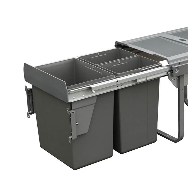 Large Triple Waste Bin – Bottom Mounted This Domestique 40L Triple Bin unit boasts the highest quality ball bearing runners that also feature soft close so your bin will not slam shut, but effortlessly slide gently back into place. It has an intuitive design: odour-eliminating, auto-close lid so your waste is sealed. It is a simple DIY installation as it mounts to the base of your cabinet (no difficult side-mounted sliders) and includes door mount brackets so you can attach it to the cupboard door. Concealed Triple Waste Storage with Soft Close SPACIOUS – Large triple dark grey bin unit comes in 1x20L and 2x10L compartments PRACTICAL – Allows for ultimate separation of garbage, recyclables or organics because of the three sections; removable bins also make it a breeze to empty and clean RELIABLE – Soft closing ball bearing runners and stable frame made from durable stainless steel can hold up to 25kg when fully extended SANITARY – Engineer designed lid prevents odours EASY INSTALLATION – Just mount to the bottom of your cabinet and choose to attach to your cupboard door for a fully integrated kitchen solution Specifications Height: 415mm Depth: 498mm Width: 412mm Colour: Dark grey Capacity: 40 litres Compartments: 1 x 20L and 2 x 10L bins Cupboard Size: Standard 450mm external width Min. Internal Cupboard Dimensions: W 420mm x D 510mm Installation: Bottom/base mount, Door mount to attach to cabinet door for pull-out Pull-out bin systems from Elite are a great value for money given their exceptional quality. Be careful to avoid inferior products that have light-weight plastic bins that are easy to break, and frames that are flimsy/do not support the weight of the bins when full and have poor quality runners.