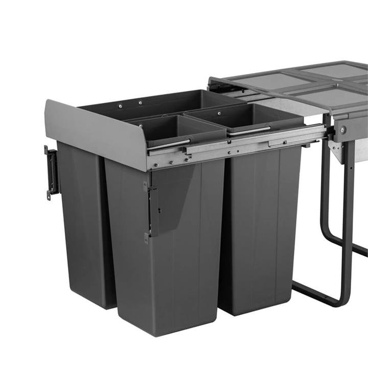Large Triple Waste Bin – Bottom Mounted This 3-section Domestique 68L Pull Out Bin unit comprises one larger 34-litre bin and two 17-litre-bins ideal for separating general waste from recyclables and compost. The waste bin fits in a standard 600mm cupboard width, however, it can be installed in a wider cabinet as it is affixed to the base. It is a simple DIY installation (no difficult side-mounted sliders) and comes with door mount brackets for added convenience. High Impact Slide Out Kitchen Waste Storage OPTIMUM CAPACITY – Large triple dark grey bin unit comes in 1x34L and 2x17L compartments FUNCTIONAL – Allows for ultimate separation of garbage, recyclables or organics because of the three sections; removable bins also make it a breeze to empty and clean HIGHLY DURABLE – Soft closing ball bearing runners and stable frame made from durable stainless steel can hold up to 25kg when fully extended SANITARY – Engineer designed lid prevents odours DIY INSTALLATION – Just mount to the bottom of your cabinet and choose to attach to your cupboard door for a fully integrated kitchen solution Specifications Height: 540mm Depth: 496mm Width: 545mm Colour: Dark grey Capacity: 68 litres Compartments: 1 x 34L and 2x17L bins Cupboard Size: Standard 600mm external width Min. Internal Cupboard Dimensions: W 550mm x D 510mm Installation: Bottom/base mount, Door mount to attach to cabinet door for pull-out Manufacturer Warranty: 5 years Pull-out bin systems are great value for money given their exceptional quality. Be careful to avoid inferior products that have light-weight plastic bins that are easy to break, frames that are flimsy and do not support the weight of the bins when full, or poor quality runners.