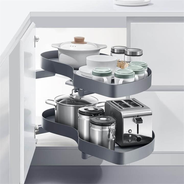 Shearer Style Swing Kitchen Corner Storage The SHEARER swing out corner storage from Higold comes with titanium grey baskets that can hold up to 30kg load of pots, pans, and other kitchen items. This soft stop Swing Corner 3.0 is the latest kitchen corner shelf unit with an upgraded mechanism, pole structure, and loading capacity. It’s a creative and efficient kitchen blind corner storage as the entire baskets are fully viewable once the unit is swung open transforming the dark corners of your cabinet into a frequently used storage! Perfect Use of Kitchen Corner Space EASY CORNER ACCESS – Maximises space of hard-to-reach corner cupboards – no need to reach into the back of your cabinets! SLEEK DESIGN – Finished with monochromatic grey, a versatile choice of colour to fit most modern homes FLEXIBLE – Separate swivel trays have adjustable height to meet different storage needs and item sizes SMOOTH OPERATION – 270-degree smooth sliding motion allows for a clearer view and more convenient picking of stored kitchenware and pantry items DURABLE AND QUALITY – Upgraded mechanism joint and strong aluminium support have a maximum loading capacity of up to 30kg Specifications Style: Shearer Swing Corner 3.0 Unit Size: W 775mm x H 550-660mm x D 465mm Minimum External Cupboard Size: W 900mm x H 600-680mm Minimum Internal Cupboard Size: W 860mm x D 490mm Minimum Cupboard Door Opening: 420mm No. of Trays: 2 Load Capacity: 30kg in total / 15kg per tray Material: (Baskets) Aerospace-grade aluminium + MDF with anti-slip mats, (Frame and mechanism) Iron Finish: Titanium grey Mounting: Bottom- and top-mount Opening: LEFT or RIGHT Soft Stop