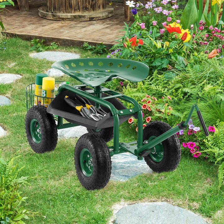 Steerable Garden Cart Rolling Scooter with Extendable Handle and Storage Basket-Green